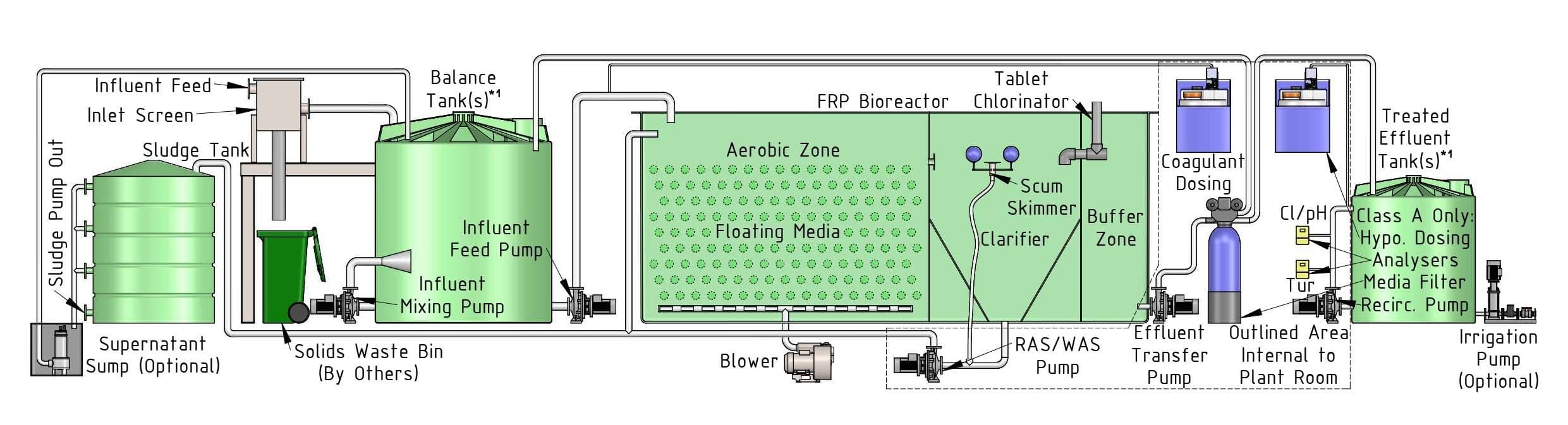 *1 Sold separately, *2 Optional equipment, *3 Plant room integral to FRP bioreactor, *4 Based on QLD guidelines, *5 Referenced from Metcalf & Eddy (5th edition, 2014), Typical composition of untreated domestic wastewater; higher/lower design values available on request.