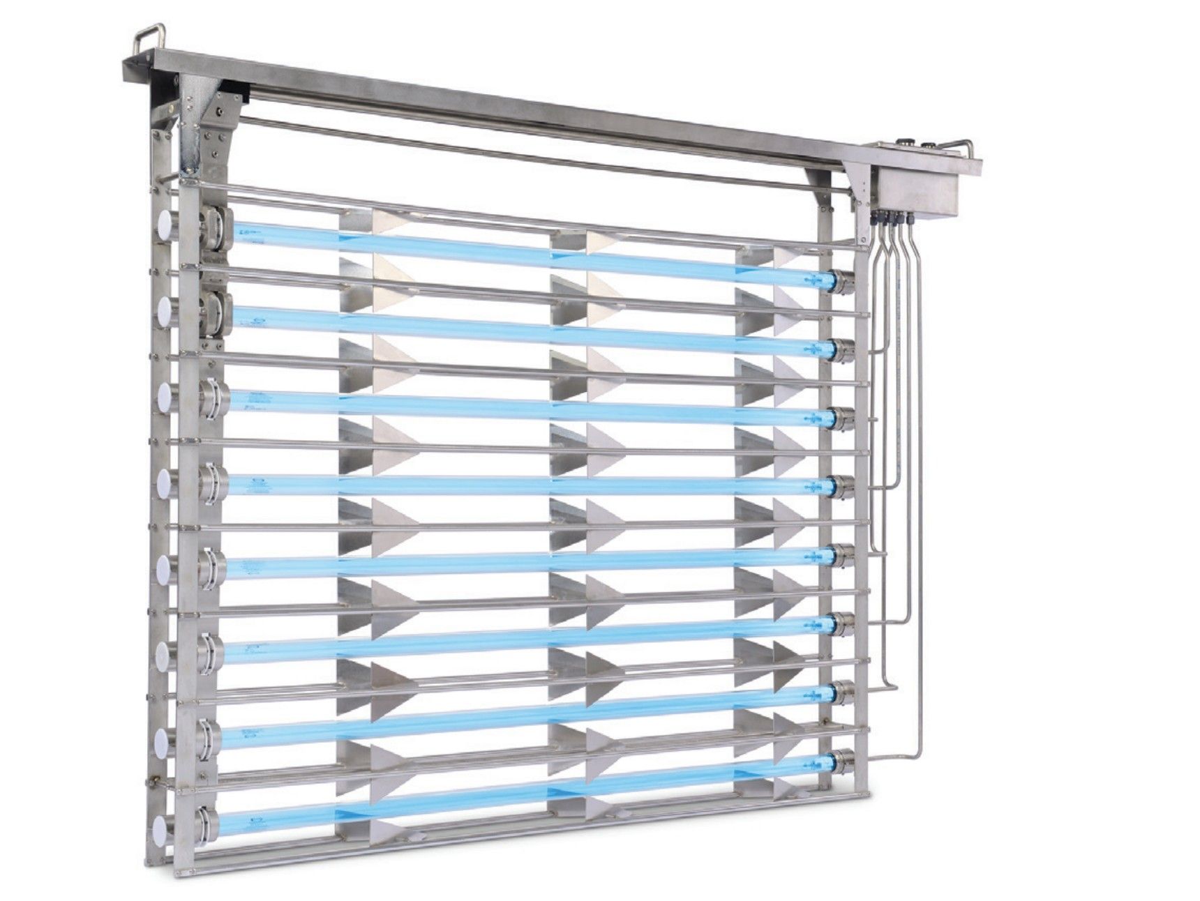 - Mechanical self-cleaning system for quartz sleeves: electrically driven, stainless steel scrapers clean automatically without hazardous chemicals.